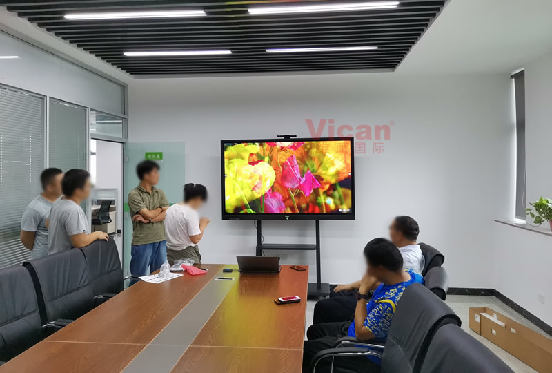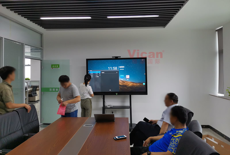 維康國際為深圳西濼辰食品公司的會議室提供了一臺75寸會議平板,采用雙系統模式,支持遠程視頻會議、無限傳屏與雙向投屏,并且精準觸控、手寫自如,采用移動小推車安裝,使用更高效、便捷。