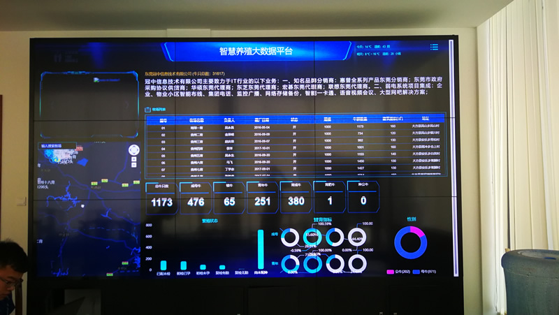 本案例中,是維康國際為云浮市某養殖場提供的大數據顯示系統,這套系統主要由3x3、55寸3.5mm拼接屏組成,主要用來做大數據信息顯示,如上圖所示。