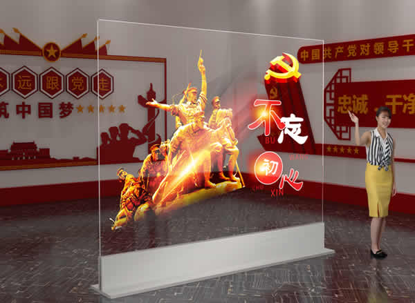 光學(xué)透明屏的顯示是采用光學(xué)數(shù)字技術(shù),具有全透明、超高清、大面積、柔輕薄的特質(zhì),對(duì)透明介質(zhì)材料進(jìn)行多層結(jié)構(gòu)調(diào)整,只會(huì)對(duì)激光光源方向的光進(jìn)行調(diào)控,對(duì)其他方向的光允許完全透過,從而實(shí)現(xiàn)全透明、高清晰的圖像顯示。通過“透明高清的顯示屏幕、虛實(shí)結(jié)合的顯示形式、AR智能的顯示手段”,創(chuàng)新的解決了黨建“靜態(tài)展示不生動(dòng)沒有帶入感,動(dòng)態(tài)展示形式不新穎不吸睛,單向展示互動(dòng)性差”等“老問題”。帶給觀眾前所未有的新鮮感、科技感,讓觀眾情不自禁的駐足觀看。透明高清的顯示屏,成為黨建的一扇窗口。