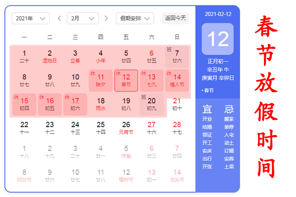 2021年2月1日-2021年2月20號為放假時間,2021年2月21日(正月初十)正式上班!