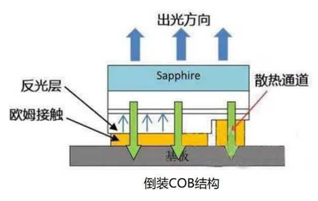 倒裝LED芯片相對于正裝芯片來說,是電極芯片的布局和實現電氣功能的方式不同。倒裝芯片的電極是朝下的,而且不需要正裝芯片的鍵合焊接工藝,這樣可以大大提高生產效率。