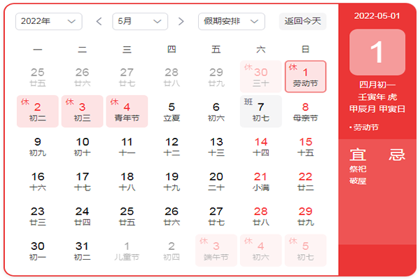 1、放假時(shí)間:2022年4月30日 - 2022年5月4日,共5天,2022年5月5日正常上班;
