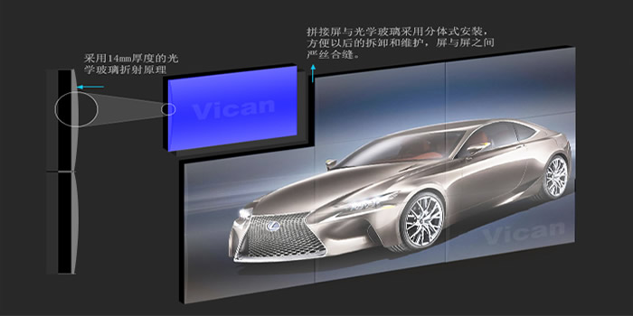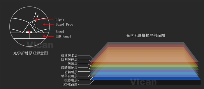 1、這款46寸無縫拼接大屏采用BFT技術,和優良高分子高透明材料PMMA,利用光線折射原理,解決液晶屏拼接存在的物理黑邊問題。