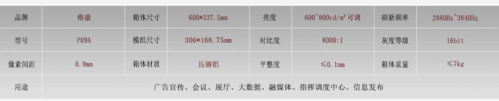 箱體尺寸為600*337.5mm,模組尺寸300*168.75mm,像素間距0.9mm,箱體重量小于6kg,亮度600~800可調(diào),灰度等級16bit,刷新率2880Hz~3840Hz,前維護(hù)安裝,8級防震,LED燈壽命大于10萬小時(shí)。