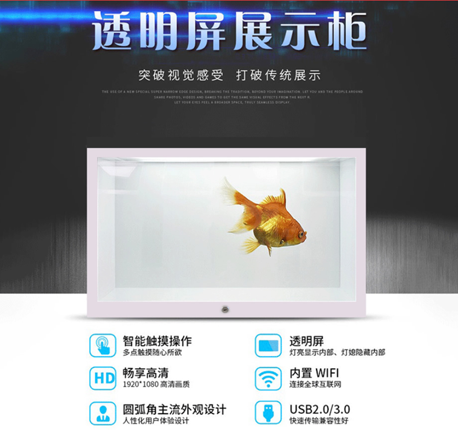 新一代液晶透明展示柜,在透明的的柜子上顯示廣告畫面,播放視頻,多角度的展示物品,柜子內(nèi)可放置物品,透明顯示屏可以進(jìn)行實物展示,信息的發(fā)布,簡約時尚其獨特的透明技術(shù)引領(lǐng)當(dāng)今時代的廣告新潮流。