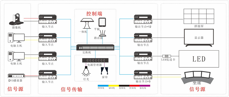 系統將音視頻采集、傳輸、控制和顯示都通過數字化網絡連接起來。采用集中式處理、網絡式控制架構,同時可以把地理上分散的各節點統一控制管理起來。并且具備極大地的靈活性和擴展性,支持音視頻信號多點共享,移動終端預覽控制、音視頻網絡交互式通信等功能。